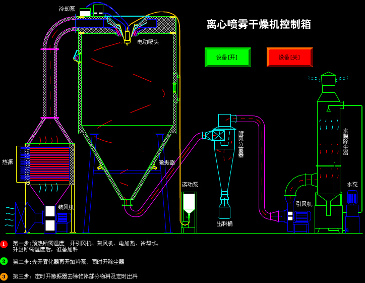 产品概述 喷雾干燥是液体工艺成形和干燥工业中 广泛应用的工艺。 适用于从溶液、乳液、悬浮液和可塑性糊状液体原料中生成粉状、颗粒状或块状固体产品。因此,当成品的颗粒大小分布、残留水份含量、堆积密度和颗粒形状必须符合精确的标准时。喷雾干燥是一道十分理想的工艺。 产品特点 干燥速度快,料液经雾化后表面积大大增加,在热风气流中,瞬间就可蒸发95%-98%的水份,完成干燥时间仅需数秒,特别适用于热敏性物料的干燥。 产品具有良好的均匀度、流动性和溶解性,产品纯度高,质量好。 生产过程简化,操作控制方便。对于含湿量40—60%(特殊物料可达90%)的液体能一次干燥成粉粒产品,干燥后不需粉碎和筛选,减少生产工序,提高产品纯度。对产品粒径,松密度,水份,在一定范围内可通过改变操作条件进行调整,控制和管理都方便。 工作原理 空气经过滤和加热,进入干燥器顶部空气分配器,热空气呈螺旋状均匀地进入干燥室。料液经塔体顶部的高速离心雾化器,(旋转)喷雾成极细微的雾状液珠,与热空气并流接触在极短的时间内可干燥为成品。成品连续地由干燥塔底部和旋风分离器中输出,废气由风机排空。 应用范围 * 化学工业: 氟化钠(钾)、碱性染料颜料、染料中间体、复合肥、甲醛硅酸、催化剂、硫酸剂、氨基酸、白碳黑等。  * 塑料树脂:AB,ABS乳液、尿醛树脂、酚醛树脂、密胶(脲)甲醛树脂、聚乙烯、聚氯乙烯等。 * 食品工业:富脂奶粉、胳朊、可可奶粉、代乳粉、猎血粉、蛋请(黄)等。 * 食物及植物:燕麦、鸡汁、咖啡、速溶茶、调味香料肉、蛋白质、大豆、花生蛋白质、水解物等。 * 糖类: 玉米浆、玉米淀粉、葡萄糖、果胶、麦芽糖、山梨酸钾等。 * 陶瓷:氧化铝、瓷砖材料、氧化镁、滑石粉等。